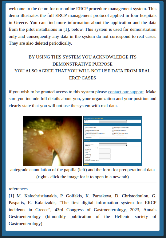 Μ. Καλοχριστιανάκης, Γ. Γερασιμάτος, Π. Γκολφάκης, Κ. Παρασκευά, Β. Παπαδόπουλος, Μ. Μουτζούκης, Δ. Χριστοδούλου, Ε. Καλαϊτζάκης, "Η πρώτη ηλεκτρονική βάση καταγραφής ERCP στην Ελλάδα: προκαταρκτικά δεδομένα από το πρώτο εξάμηνο λειτουργίας σε 4 κέντρα", 44th Panhellenic Gastroenterology Conference, 2024, Athens